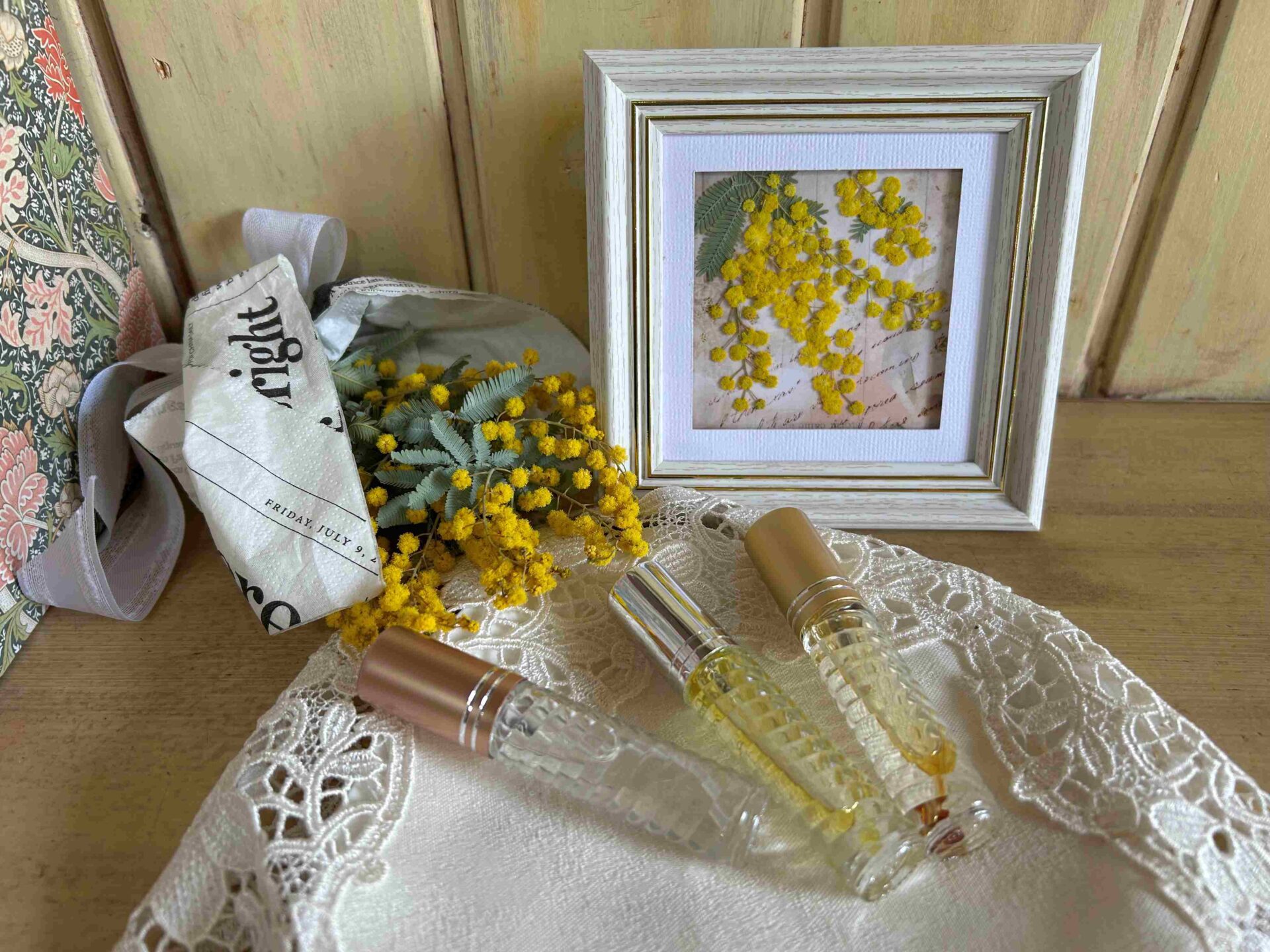 額の大きさ 12×12㎝ 作品のサイズ 8×8㎝ アロマボトル 25ml 本物のお花を使用している為、1点物となります。(写真はイメージです。) お花の色は変色防止加工を施しておりますが、湿気、直射日光により変色の可能性があります。