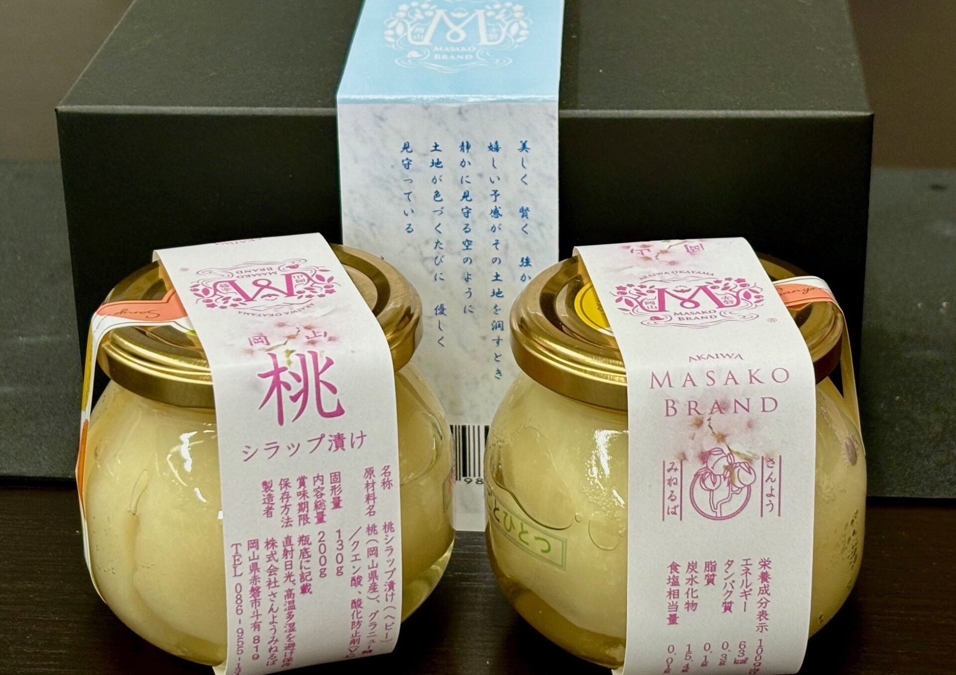 ・原材料名:桃(岡山県産)グラニュー糖/クエン酸、酸化防止剤(V.C)・固形量:130g・内容総量:200g・賞味期限:製造日より1年間・保存方法:直射日光、高温多湿を避け保存