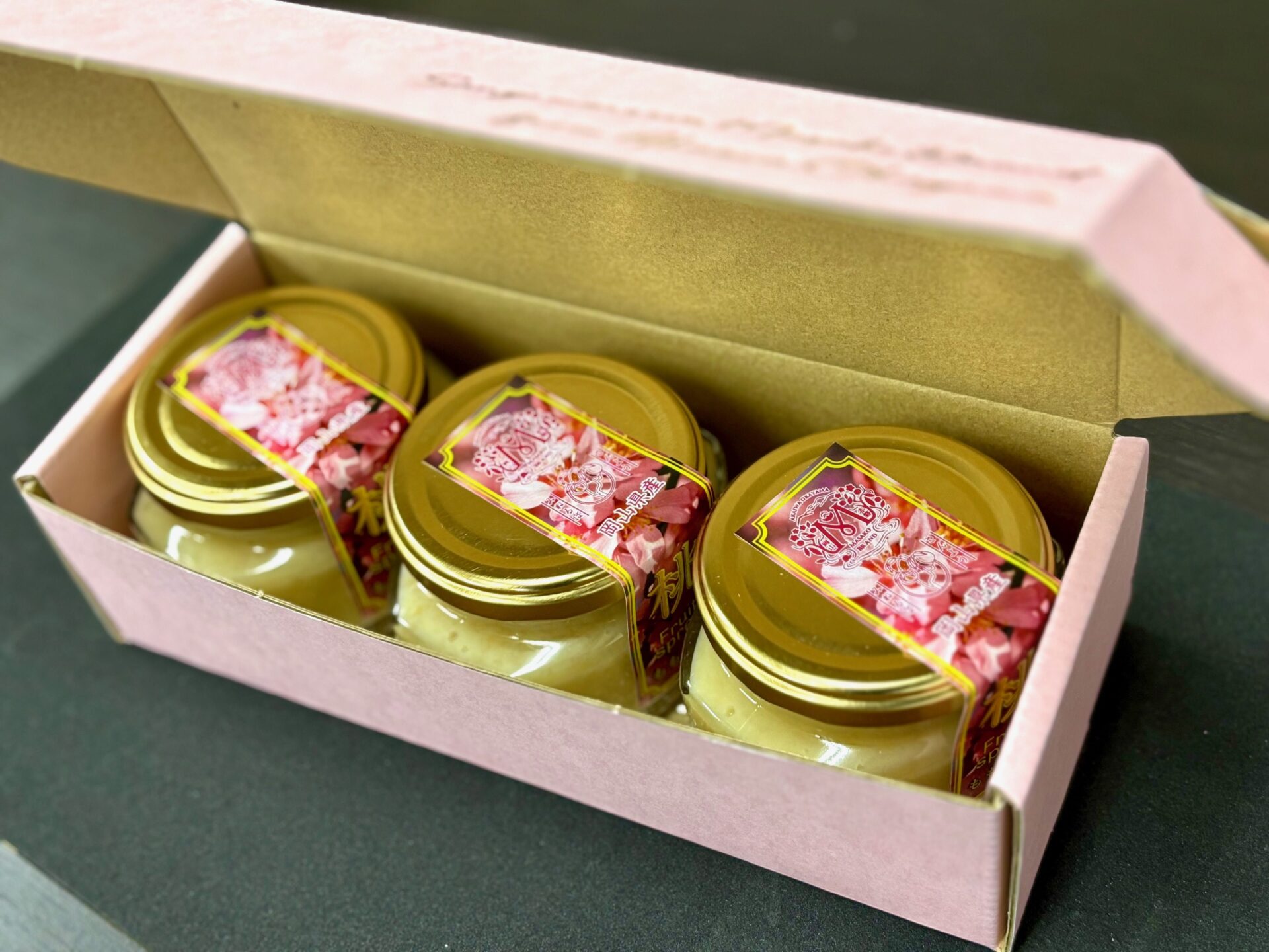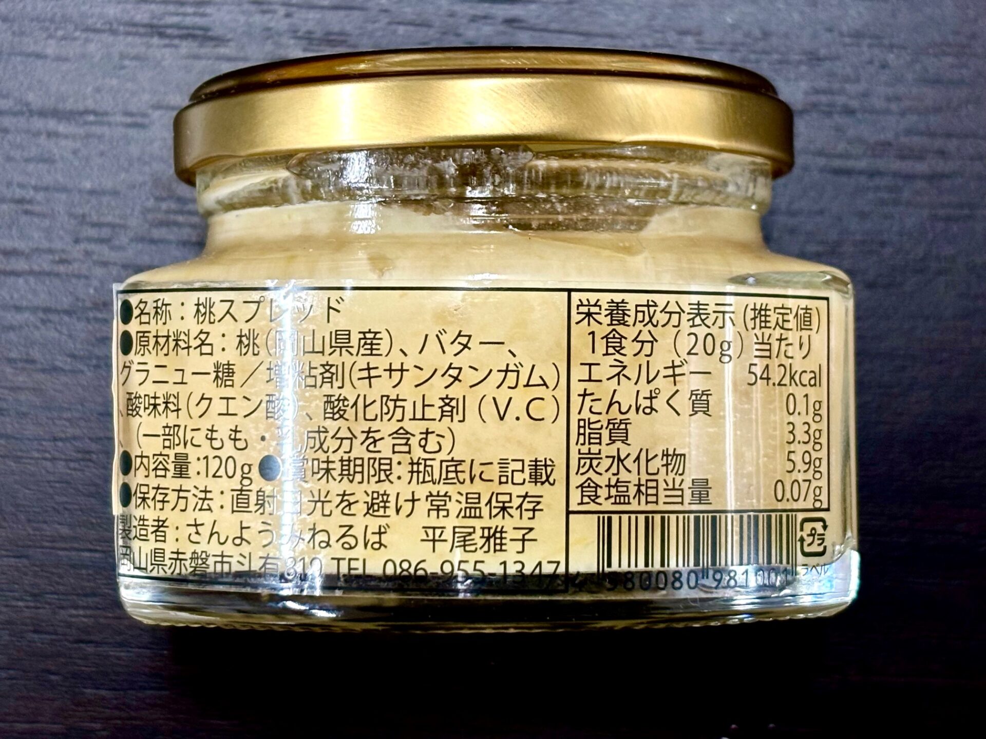 ≪名称:桃バター≫・原材料名:桃(岡山県産)、バター、グラニュー糖/増粘剤(キサンタンガム)、酸味料(クエン酸)、酸化防止剤(V.C)、(一部に桃・乳を含む)・内容量:120g×3個・賞味期限:製造日より1年間・保存方法:直射日光を避け常温保存