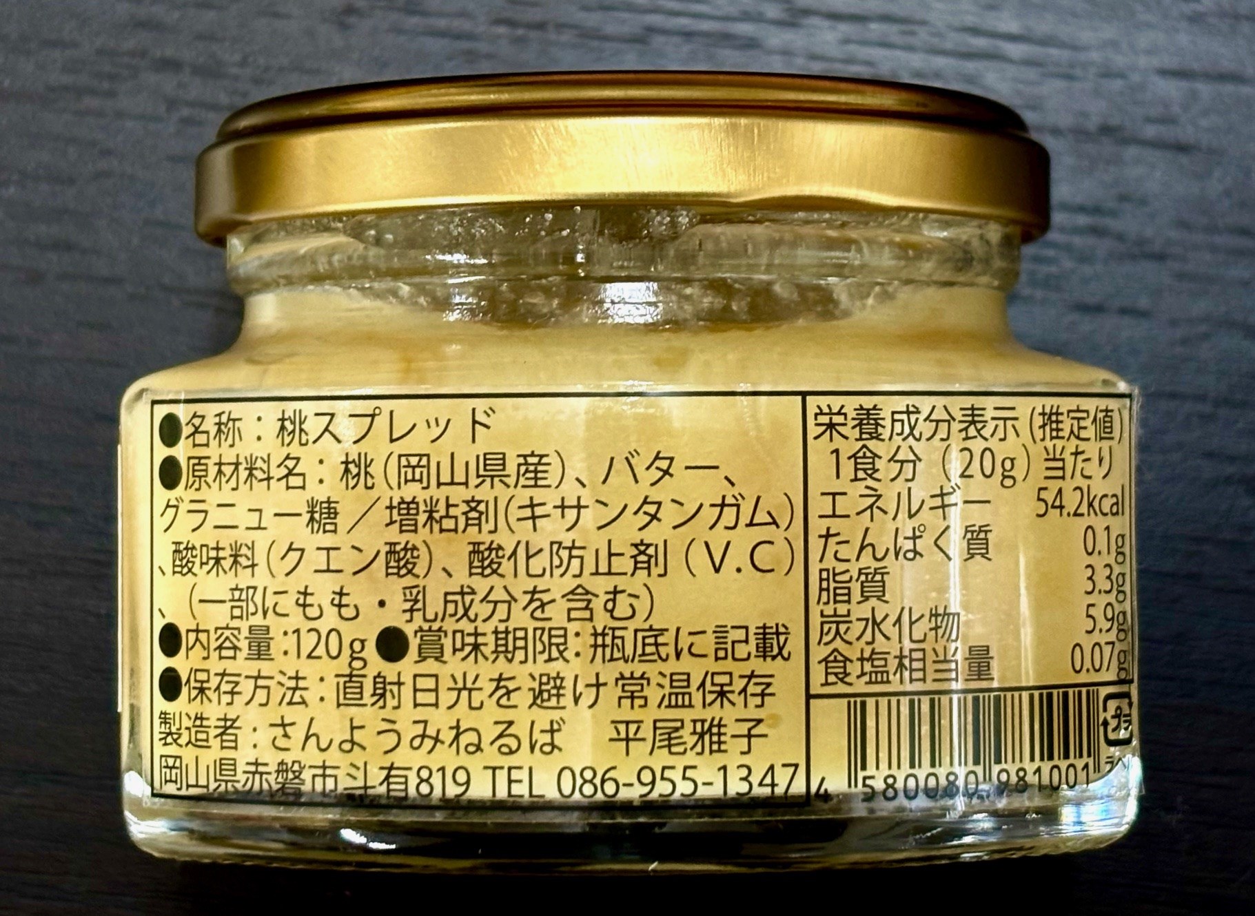 ・原材料名:桃(岡山県産)、バター、グラニュー糖/増粘剤(キサンタンガム)、酸味料(クエン酸)、酸化防止剤(V.C)、(一部に桃・乳を含む)
