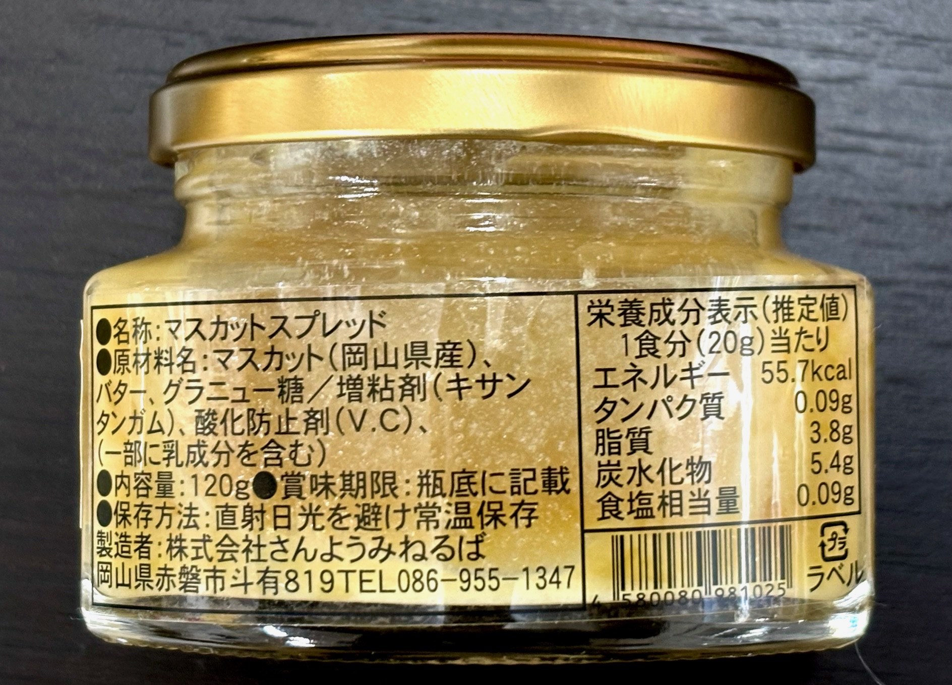 ・原材料名:マスカット(岡山県産)、バター、グラニュー糖/増粘剤(キサンタンガム)、 酸化防止剤(V.C)、(一部に桃・乳を含む)