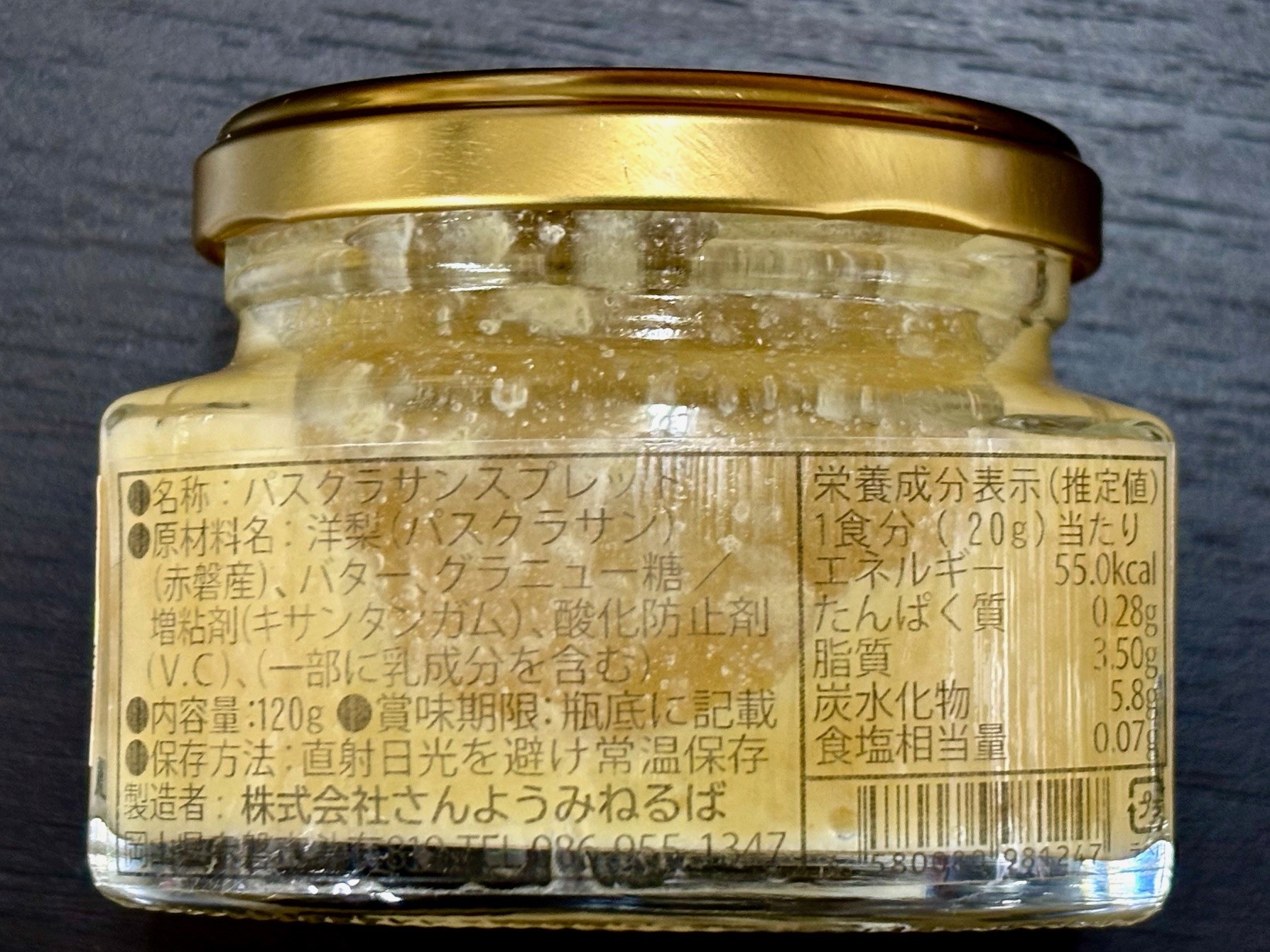 ・原材料名:パスクラサン(赤磐産)、バター、グラニュー糖/増粘剤(キサンタンガム)、酸化防止剤(V.C)、(一部に桃・乳を含む)